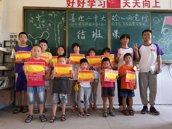 最后一节课如同往常一般,孩子们坐在板凳上,志愿者站在讲台上,不同的是,志愿者们讲的不是书本上知识,而是对孩子们诚挚的寄语,“我希望我们能在你们的心中埋下一颗种子,接下来的浇灌与施肥要靠你们自己啦”“以后遇到困难,一定要坚强面对”“一定要走出大山,祝你们前程似锦……”志愿者们走上讲台,说出想对孩子们说的话。志愿者们说完,便轮到了孩子们,他们认认真真、一笔一划地写下心中所想,写好后便交到志愿者手中,五颜六色的卡纸被收集在一起,方便课后志愿者们一起阅读并好好收藏。最后的环节是为孩子们颁发奖状,每一张奖状都寄托着志愿者对孩子们的期望,每一双小手接下一张奖状,都标志着一颗希望的种子被种下,接下来便是新的开始,是孩子们奔向更广阔未来的开端。
