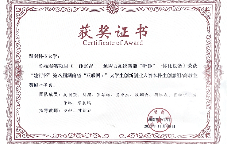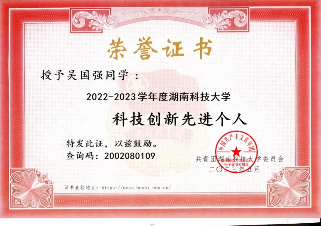 大学期间,班级累计获得国家级奖项 11 项,省级奖项 23 项,校级奖项 176 项,同时还在学术科研方面取得突出成绩,累计科研立项校级及以上共 7 项,申请专利 12 项,发表学术论文 2 篇。其中,万功兴同学获得beat365亚洲版官网 2023 年度“十佳大学生”,吴国强同学作为项目负责人获得第十八届“挑战杯”全国大学生课外学术科技作品竞赛二等奖,刷新了学校十多年来在该赛事上的最好成绩。