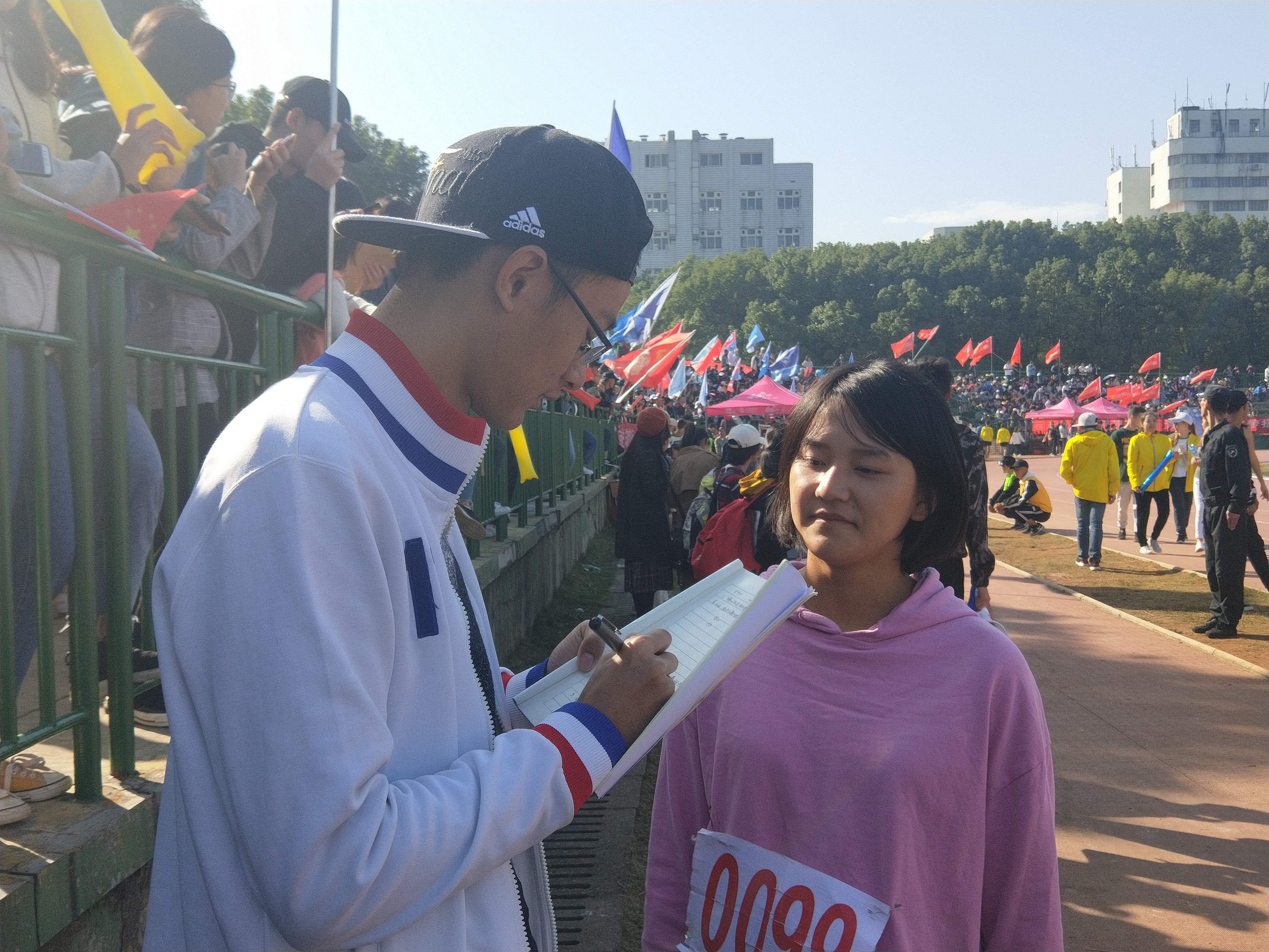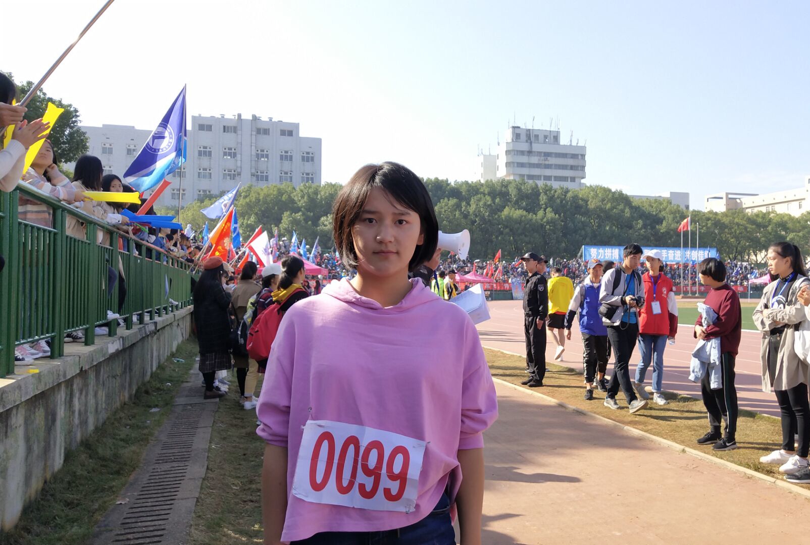 秋日暖阳,缕缕金光落满赛场;锣鼓喧天,声声呐喊贯彻云霄。比赛开始前,郑瑾选手为了克服心目中三级跳最难的部分——步伐的控制和落地时的踩稳,便反复地训练和适应。提膝、弓步,她反复地拉着韧带,以便于寻找到最好的状态去参与比赛。比赛开始了,随着旗帜的落下,郑瑾选手挥动双臂,迈开步子,加快步伐。在到达白线时,她猛然一跳,气势如石破天惊般地向前跃去,落地,再奋力向前跨出一大步,最后在刹那间双腿合并,双臂一挥,竭力向前一跃,落入沙坑之中。瞬间,赛场上爆发出雷鸣般的掌声。比赛结束后,郑瑾选手咧着嘴,带着赛后的轻松和愉悦,在采访时说道:“为了准备这次的三级跳比赛,我不断地加大训练,遇到问题时,向学长学姐请教,来完善自我。通过这次比赛,我明白了奋斗和尽力是对比赛的尊重,同时也是我所信仰的运动精神。”